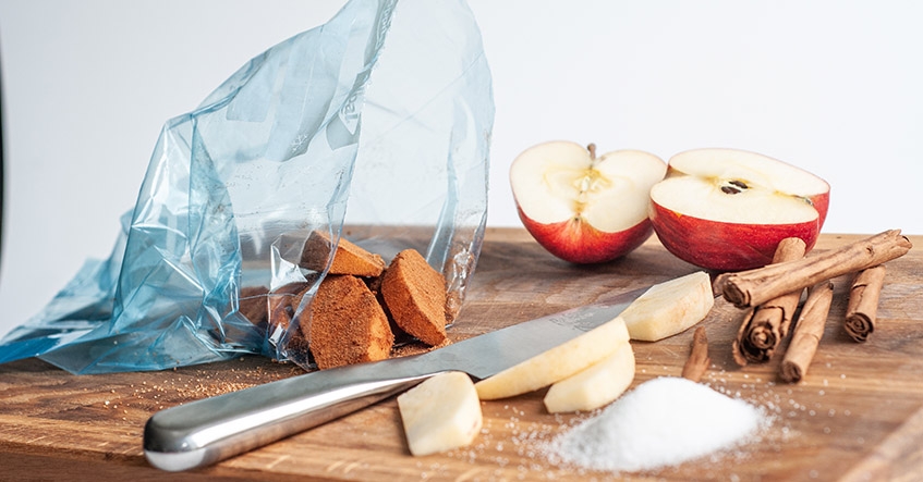 Ta fram färskosten så att den blir rumstempererad. Skala och dela äpplen i tunna klyftor. Riv skalet och pressa saften ur limen. Blanda äpple med limeskal, limesaft, socker och kardemumma i en Toppits® fryspåse. Lägg åt sidan att marinera.
