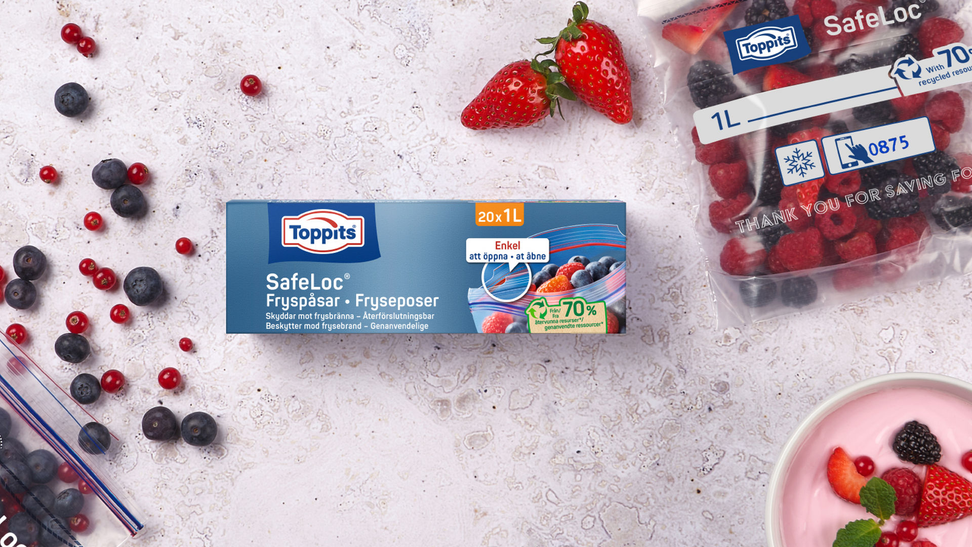 Förutom korrekt bortskaffande, för miljöns skull, finns det också möjlighet att återanvända Toppits® fryspåsar . Med mindfulness och miljömedvetenhet kan de användbara hjälparna i vardagen användas på ett hållbart sätt. Återvinning spelar också en stor roll. Toppits® fryspåsar är tillverkade av 35 % återvunna resurser . I framtiden kommer även detta att byggas ut ytterligare för att på sikt öka hållbarheten på fryspåsarna . Dessa resurser är till exempel organiska restprodukter från livsmedelscykeln som är ofarliga för förvaring av livsmedel. Här kan du läsa mer om detta och hur massbalansen går till.